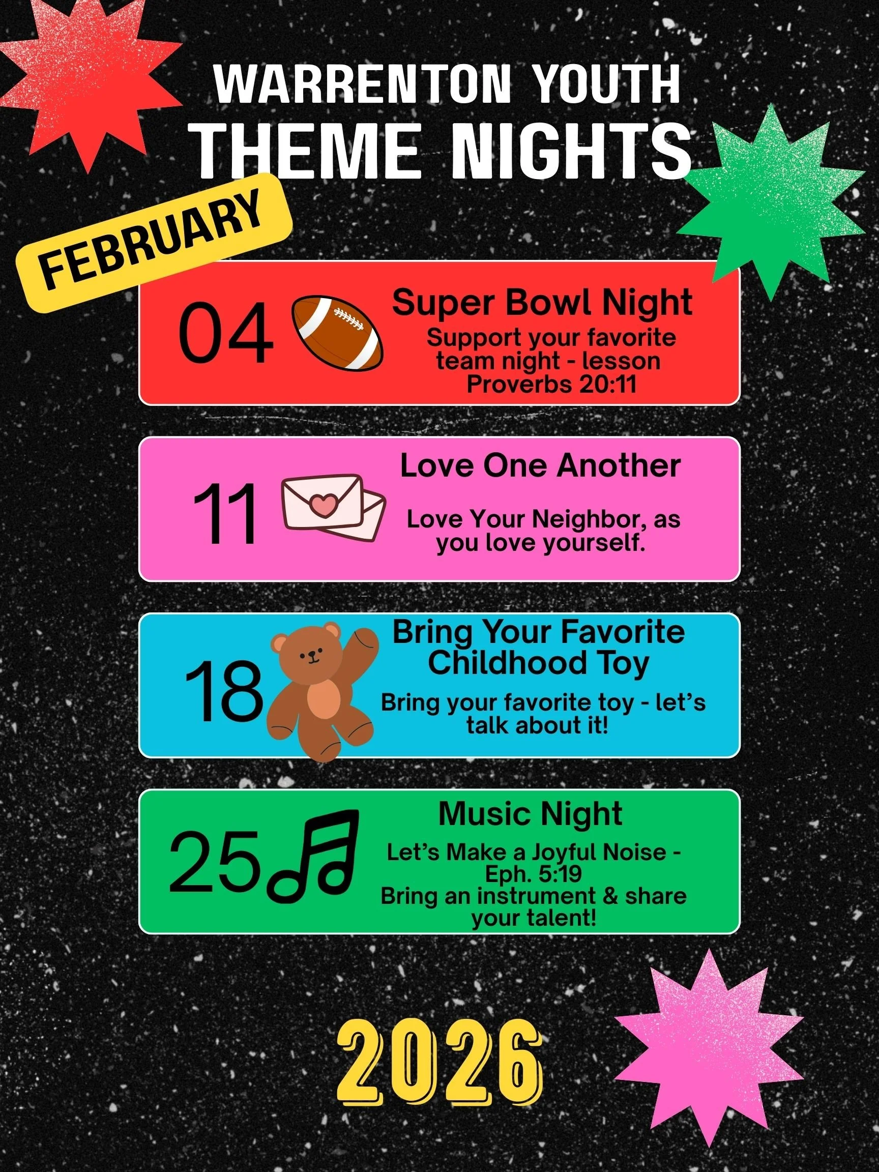 Youth Ministries Our heart is for every student to be a great example and show their love for Christ by having undeniable experiences with God, being productive in society, flourishing in their callings, and being planted in God’s house.Youth Class 6th thru 12th grade Sunday School: 11:00am - 11:45amWednesday Night Bible Study: 6pm – 7pm